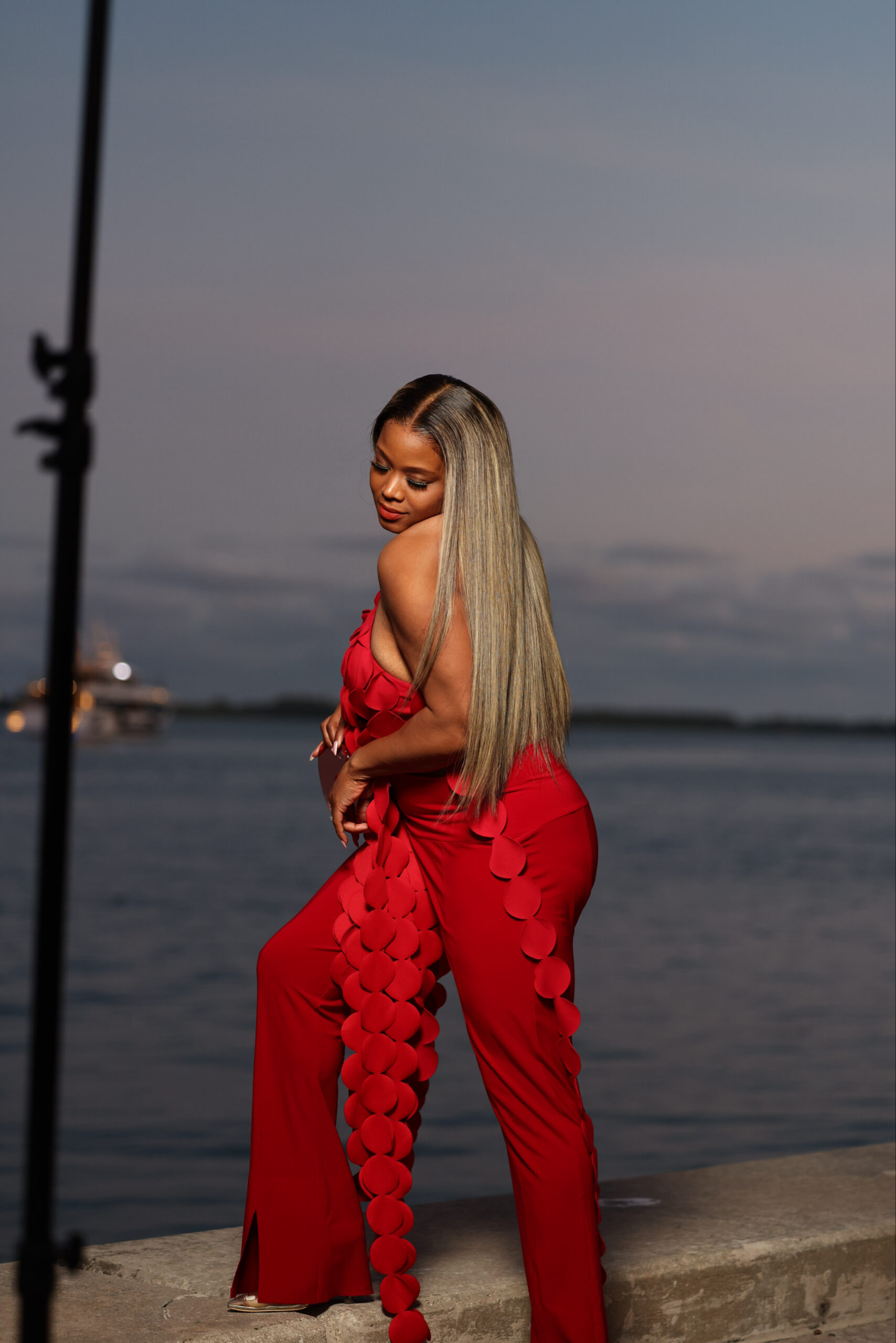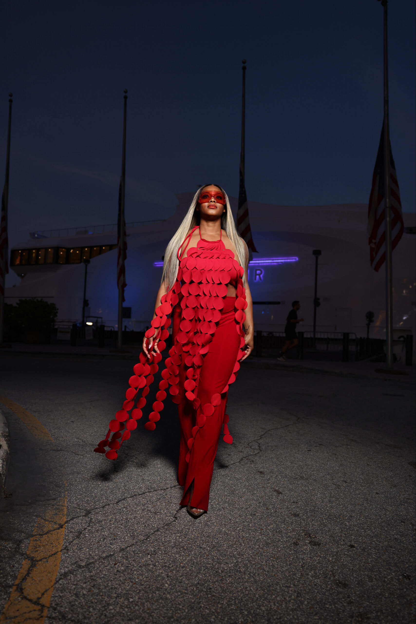 When in doubt, wearing the same color from head to toe has never steered me wrong. I felt bold in a red Shop Akira top and Norma Kamali pants, topped off by a wig from Becky with the Good Hair, and Gucci shades.