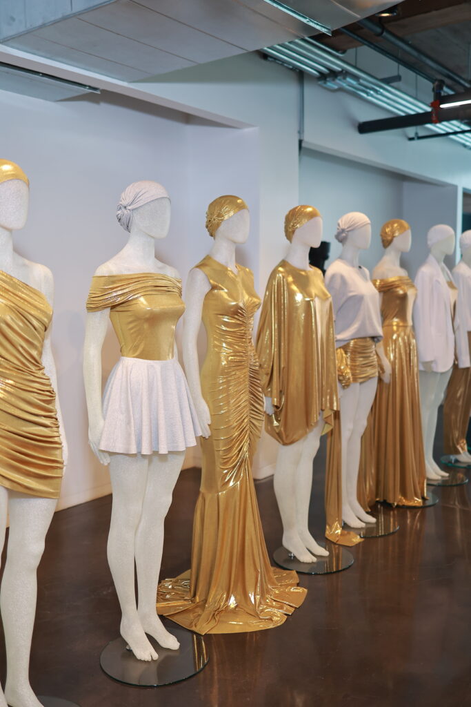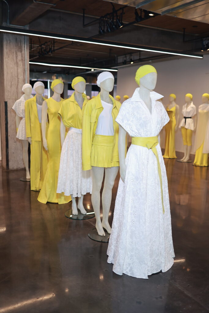 This season builds upon the brand’s signature silhouettes while introducing fresh, modern expressions. Crisp white eyelet dresses were cinched with sunlit yellow belts, sculptural gold-foil jersey gowns shimmered under the lights, and off-the-shoulder metallic minis were paired with soft heather-grey skater skirts for contrast.